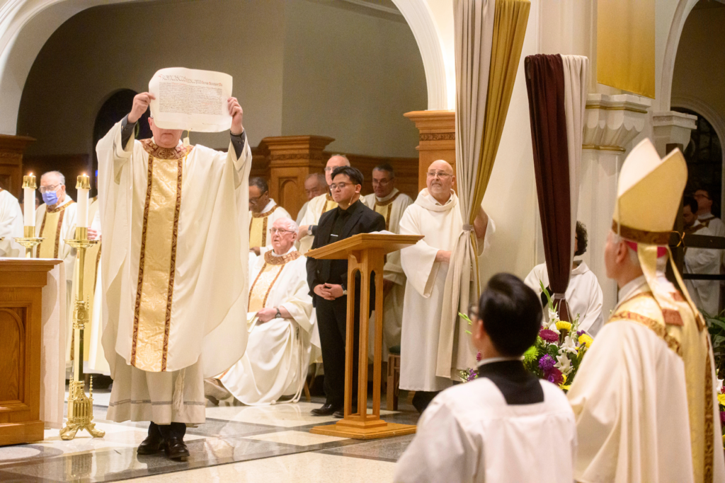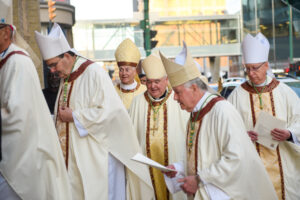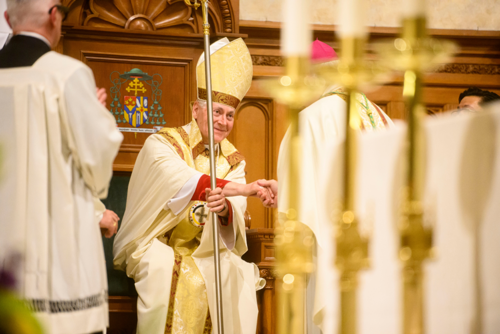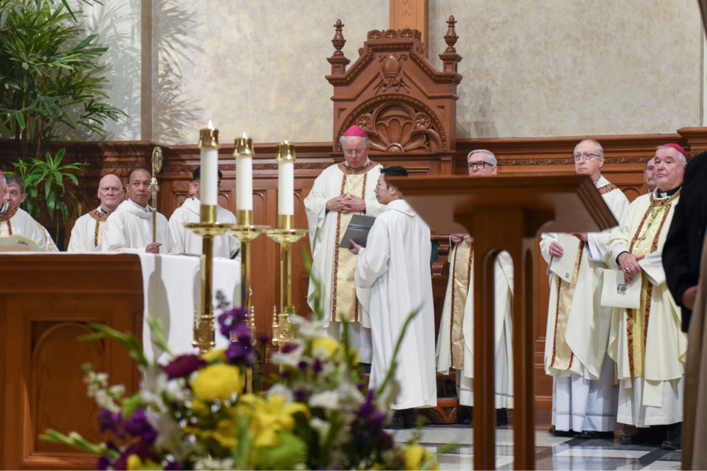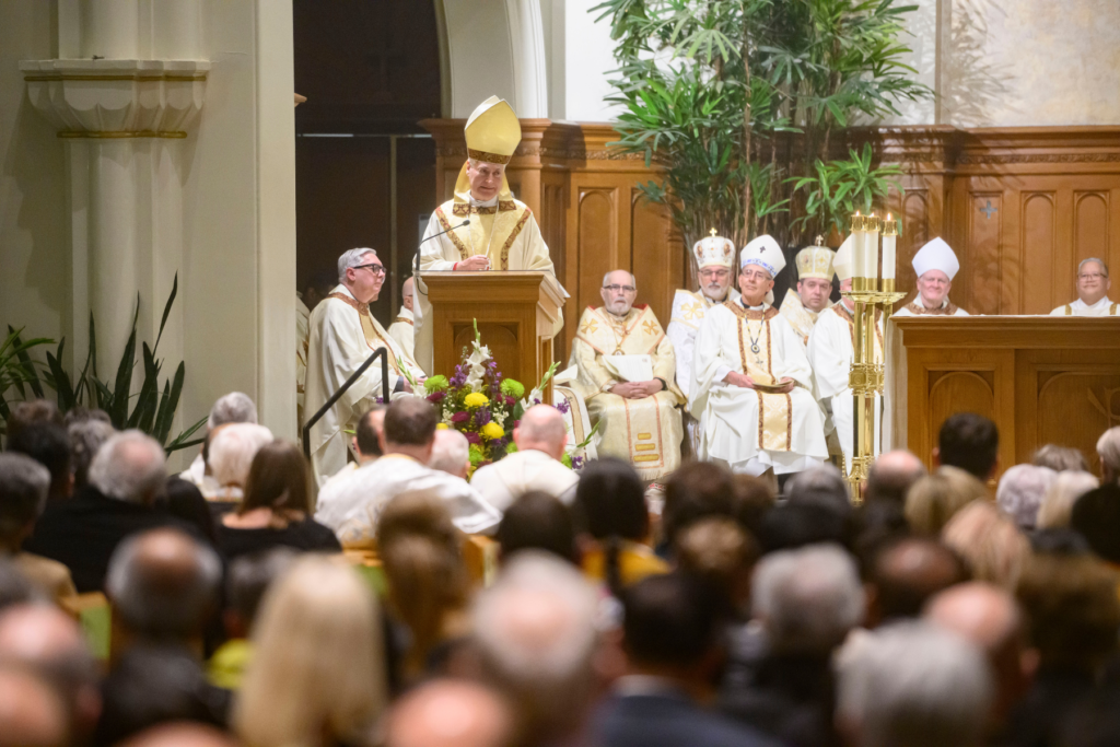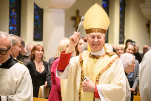 As the procession moved towards the Cathedra, or Archbishop’s Chair, Archbishop Chatlain blessed the gathered assembly with Holy Water, marking his first pastoral act among his new community.