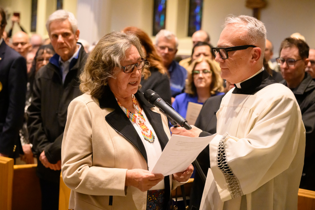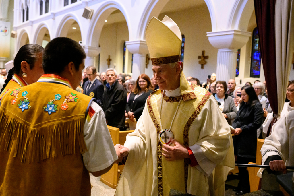 The welcome included Indigenous drumming and an honour song by Victor Tssessaze and his son, Daylon Tssessaze, from Lac Brochet, Manitoba. Shirley Roulette, an Anishinaabe Elder, welcomed Archbishop Chatlain to the Treaty One territory, and Joan Chartrand Molloy, brought greetings to the new Archbishop from the Red River Metis. Winston Wuttunee, from the Nêhiyawêwin Nation and a member of St. Kateri Tekakwitha Parish, performed a sweetgrass smudging, followed by drumming and an honour song for Archbishop Chatlain – a traditional and symbolic gesture of purification and welcome.