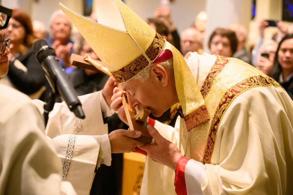 The celebration began with a traditional welcome. Most Reverend Ivan Jurkovič, the Apostolic Nuncio to Canada, greeted Archbishop Chatlain, who stood at the Cathedral entrance. The assembly then turned as Fr. Geoffrey Angeles, the Cathedral Rector, welcomed Archbishop Chatlain at his new Cathedral Church, presenting him with a crucifix to reverence.