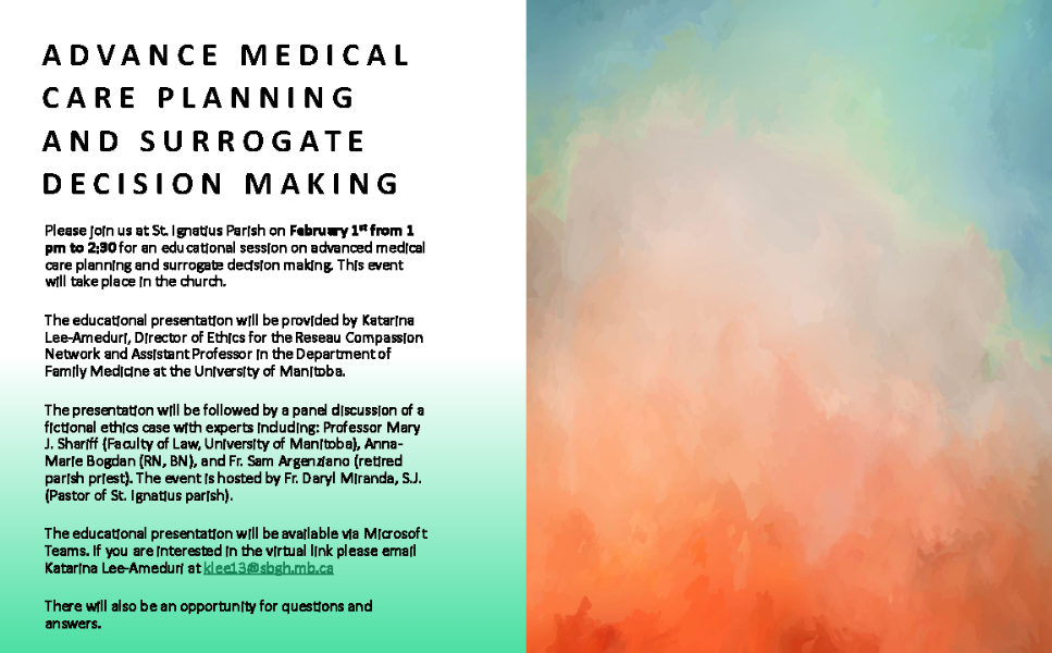 Please join us at St. Ignatius Parish on February 1 from 1:00 – 2:30 pm for an educational session on advanced medical care planning and surrogate decision-making. The presentation will be provided by Katarina Lee-Ameduri, Director of Ethics for the Reseau Compassion Network and Assistant Professor in the Department of Family Medicine at the University of Manitoba. The presentation will be followed by a panel discussion of a fictional ethics case with experts including Professor Mary J. Shariff (Faculty of Law, University of Manitoba), Anna-Marie Bogdan (RN, BN), and Fr. Sam Argenziano (retired parish priest). This presentation will be available via Microsoft Teams. If you are interested in using the virtual link, please email Katarina Lee Ameduri at klee13@sbgh.mb.ca.