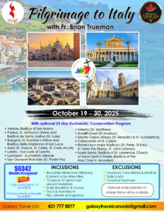 Join CCRS of MB on an incredible pilgrimage to Italy from October 19th to the 30th, 2025. They will visit many of the most beautiful cathedrals in the world! This is an excellent opportunity to see the remains of many apostles and evangelists and walk through the “Holy Doors” of the four major Basilicas of Rome during the Jubilee Year. All details are on the attached flyer. Limited Space. For more information, 204-895-7544 or email ccrs@catholicrenewalservices.com.