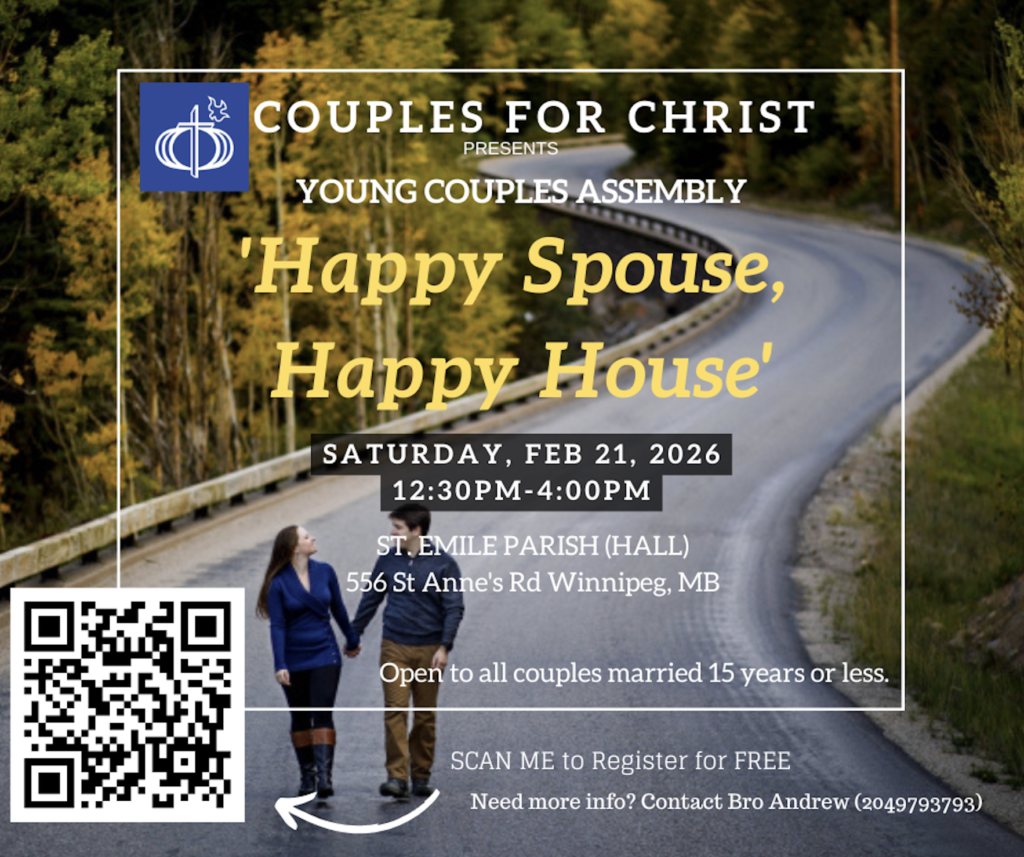 Young couples are invited to an enjoyable and meaningful afternoon session titled “Happy House, Happy Spouse” on Saturday, Feb 21, 2026, 12:30 PM-4:00 PM at St. Emile Parish Hall, 556 St Anne’s Rd in Winnipeg. This gathering offers practical wisdom to help husbands and wives understand their complementary differences, improve communication, and cultivate the virtues that contribute to a strong and grace‑filled marriage. Participants can expect a chance to learn, laugh, and grow—because a happy spouse truly helps create a happy home. Click here to register.