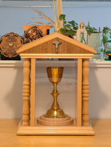 The chalice itself originates from the days of Jesuit priests at St. John Brebeuf Parish. The Serra Club of Winnipeg graciously sponsored the refurbishment of this chalice, arranging for it to be sent to Montreal for restoration. After the chalice returned beautifully regilded, a parishioner from St. John Brebeuf generously volunteered to craft the wooden case in which the chalice now sits.